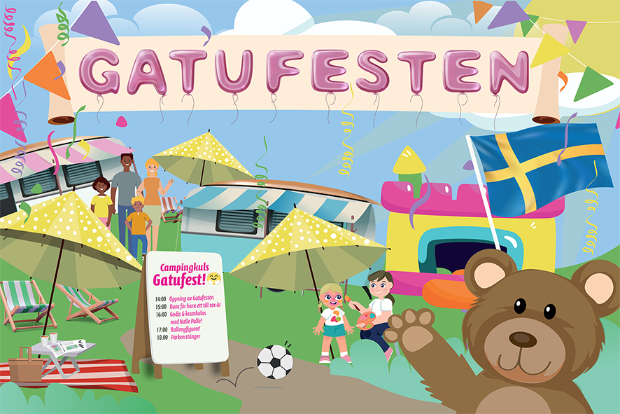 Gatufesten! Ett koncept som är en självklarhet i alla små holländska städer. Det kanske inte alltid är exakt en gata men en yta vi fyller med allt du kan förvänta dig finns på ett riktigt kul kalas. Är det inte en speciell känsla när alla kan mötas på en gemensam positiv plats såsom en gatufest? Unga som äldre, hundar som katter, alla är välkomna på vår gatufest! Vi skapar stämning och glädje med hjälp av musik, spel, överraskningar, ballongfigurer, pyssel och självklart finns det kaffe. Missa inte att träffa vår kramgoa Nalle Palle som kommer på besök med kramar och godis! och ett sista tips är att prova gärna vår femkamp i lag (det finns en QR kod) eller spontant.